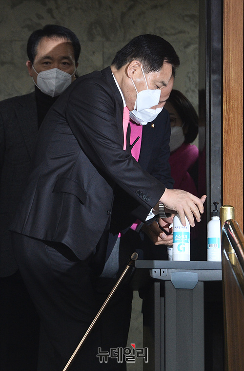 심재철 미래통합당 원내대표 등 지도부가 28일 오전 원내대책회의에 입장하며 손 소독제를 사용하고 있다.