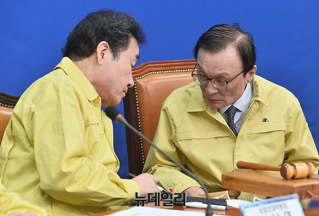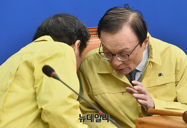 이해찬 더불어민주당 공동상임선대위원장과 이낙연 공동상임선대위원장이 28일 오전 국회에서 열린 제2차 선거대책위원회 회의에서 귀엣말을 하고 있다.