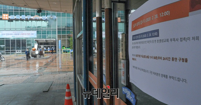 '코로나19(중국 우한 폐렴)' 확진자가 2,000명을 돌파하고 사망자는 13명으로 늘어난 28일 오후 서울 성동구청을 찾은 시민들이 출입통제 안내문을 보고 발걸음을 돌리고 있다.