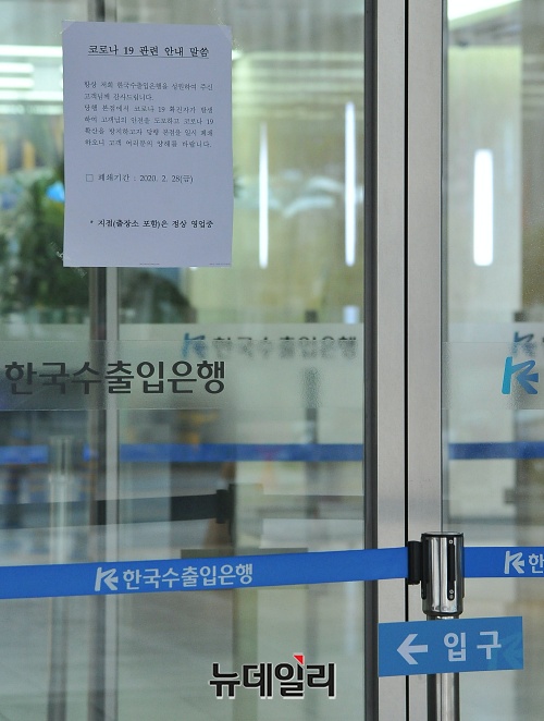 수출입은행은 28일 본점 직원이 확진 판정을 받은 것을 통보 받고 본점을 긴급폐쇄하고 방역 작업에 들어갔다. 본점이 문을 닫은 것은 이번이 처음이다.