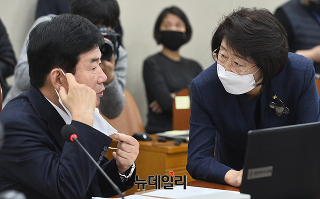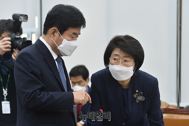 더불어민주당 소속 김진표 코로나19 대책 특별위원장과 김승희 미래통합당 간사가 2일 오전 국회에서 열린 '코로나19 특위 1차 회의'에서 대화를 나누고 있다.
