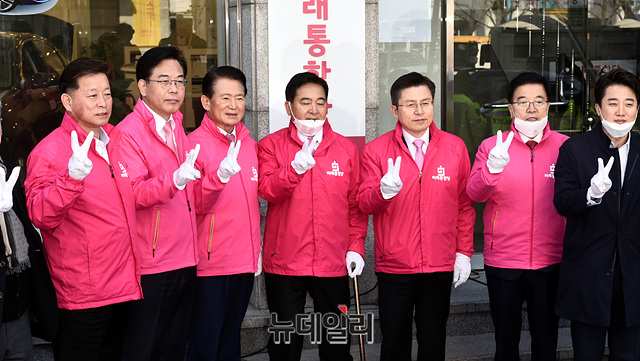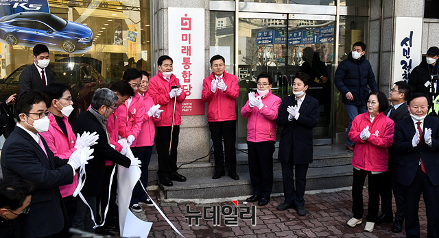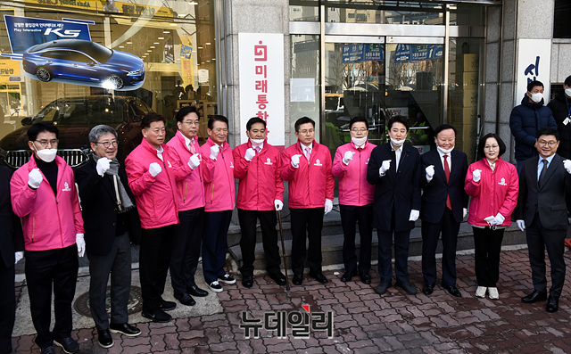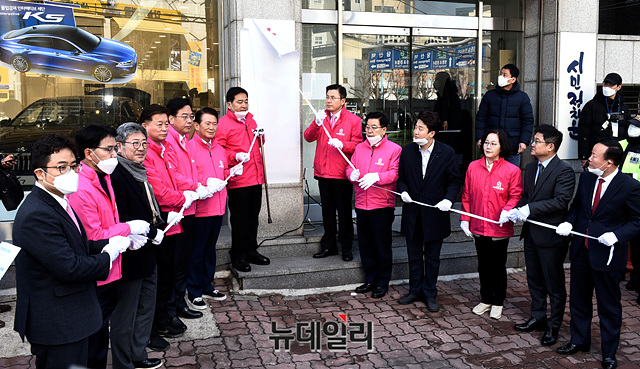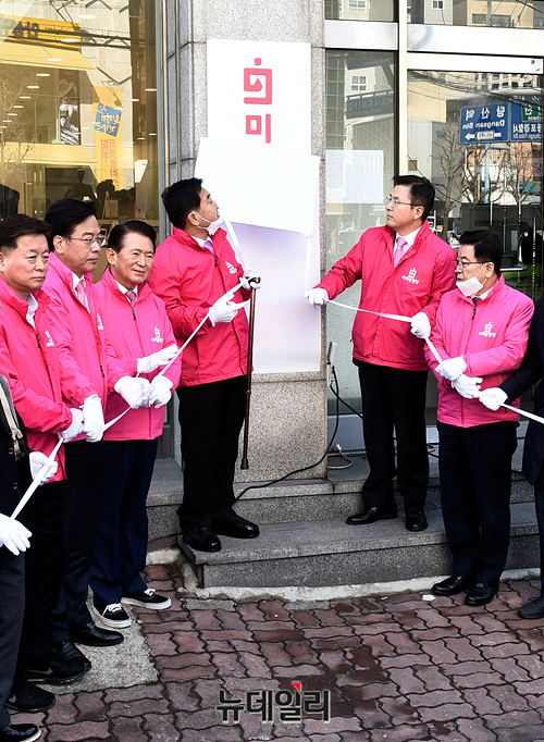 황교안 미래통합당 대표, 심재철 원내대표 등 참석자들이 2일 오전 서울 영등포구 미래통합당 중앙당사에서 현판식을 갖고 기념촬영을 하고 있다.
