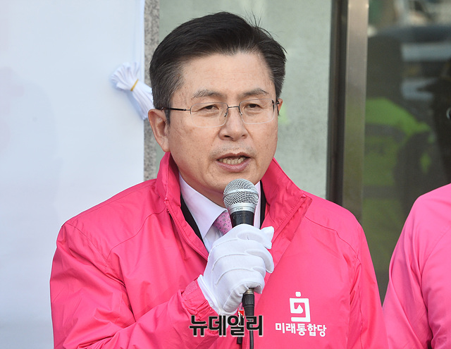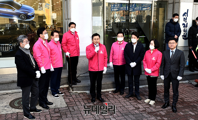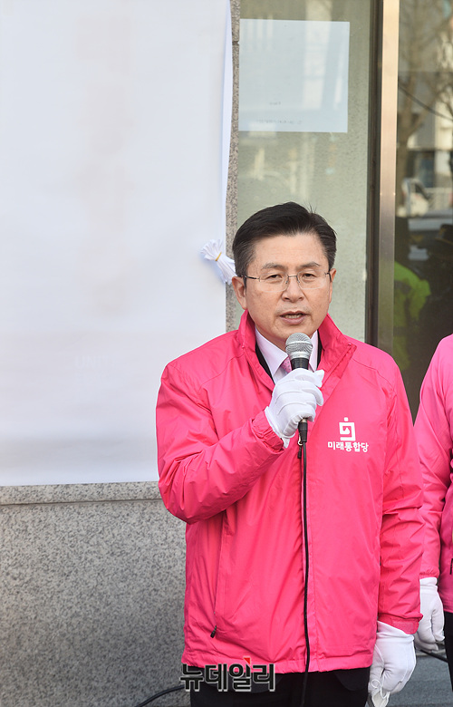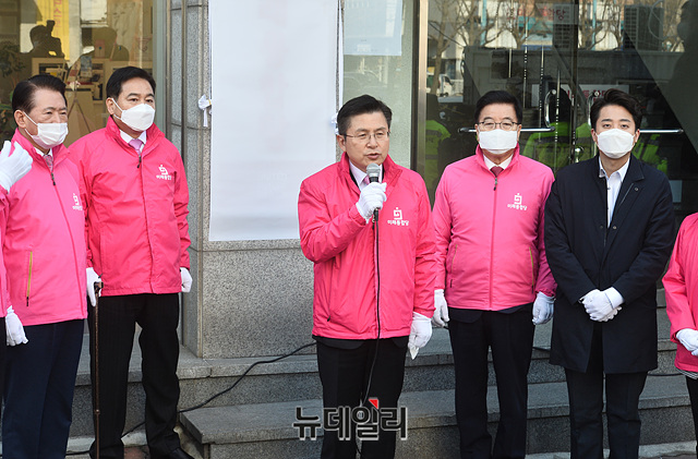 황교안 미래통합당 대표가 2일 오전 서울 영등포구 미래통합당 중앙당사에서 열린 현판식에서 인사말을 하고 있다.