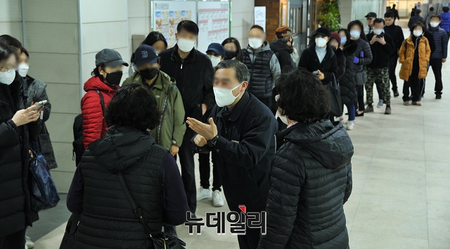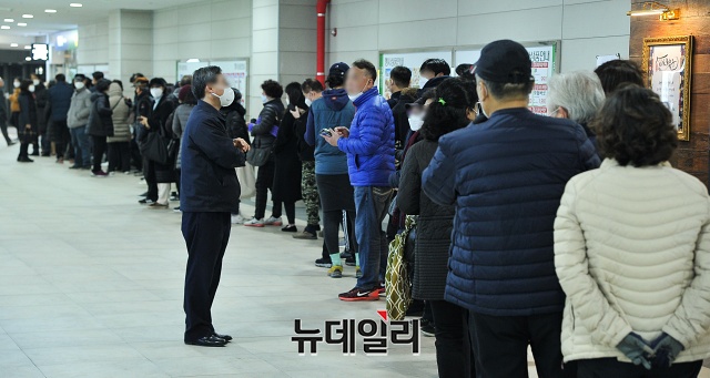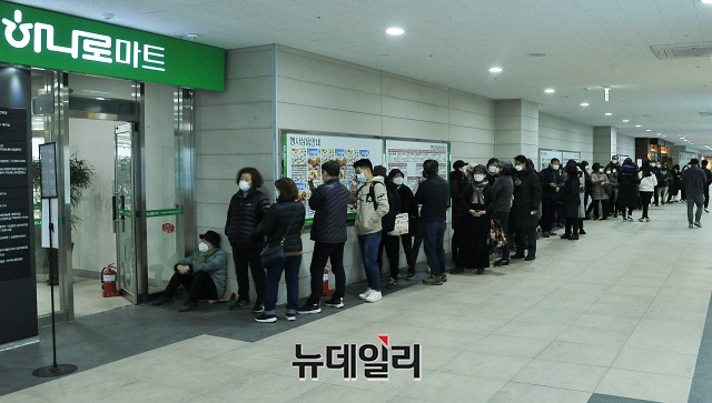 '코로나19(중국 우한 폐렴)' 확진자가 4,000며 명을 돌파한 2일 오전 서울 송파구 송파농협 하나로마트에 시민들이 마스크를 사기위해 줄을 서서 대기하고 있다.줄을 선 한 시민은 "14시부터 판매되는 마스크를 사기 위해 10시부터 와서 대기했다"며 "서울지역이 마스크 구매하기 더 어려운것 같다"며 불만을 토로했다.하나로마트 관계자는 "물량이 녹록치 않아 줄이 더 길어질 경우 번호표를 나눠준다"고 설명했다.
