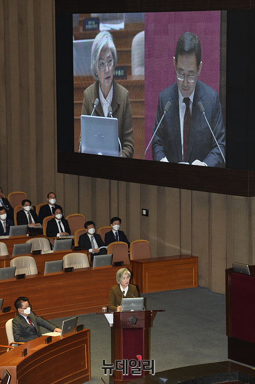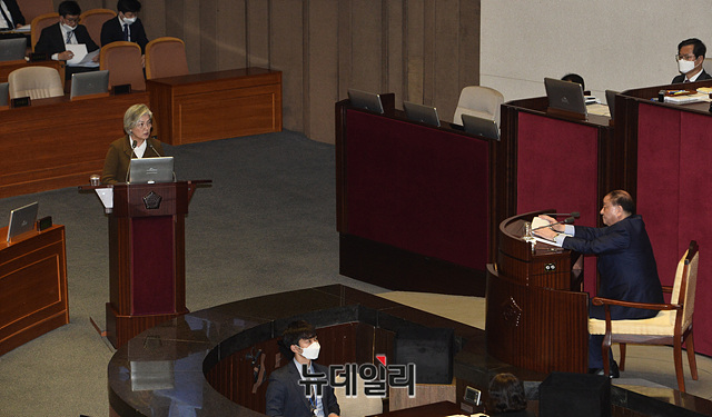 강경화 외교부 장관이 2일 오후 국회 본회의장에서 열린 제376회 제5차 본회의에서 외교 분야 대정부질문에 답하고 있다.