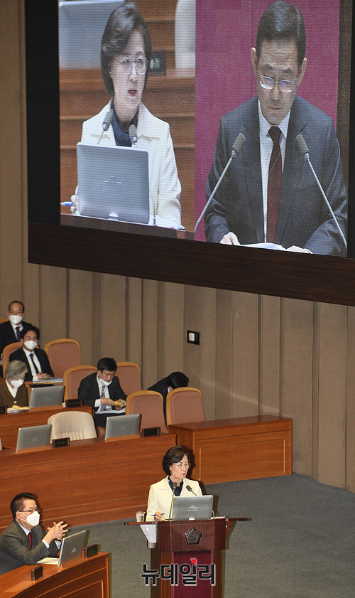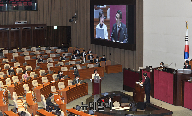 추미애 법무부 장관이 2일 오후 국회 본회의장에서 열린 제376회 제5차 본회의에서 정치·외교·통일·안보 분야 대정부질문에 답하고 있다.