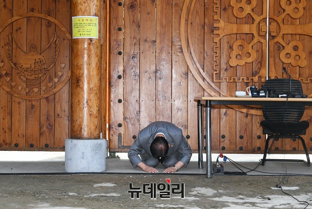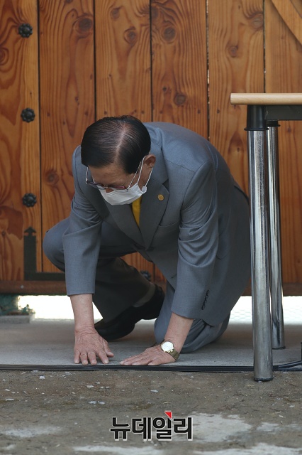 이만희 '신천지예수교 증거장막성전(신천지)' 총회장이 2일 오후 경기 가평군 신천지 평화연수원에서 '코로나19(중국 우한 폐렴)' 관련 공식 입장을 밝히는 기자회견에서 "국민과 정부에게 죄송하다"며 큰 절을 하고 있다. (경기 가평=권창회 기자)