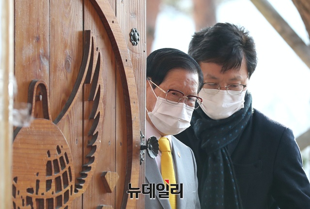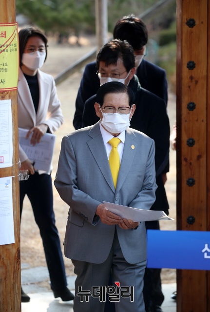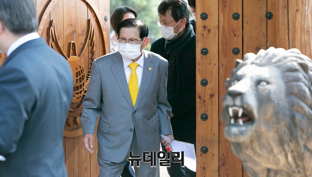 이만희 '신천지예수교 증거장막성전(신천지)' 총회장이 2일 오후 경기 가평군 신천지 평화연수원에서 '코로나19(중국 우한 폐렴)' 관련 공식 입장을 밝히는 기자회견에 입장하고 있다.(경기 가평=권창회 기자)
