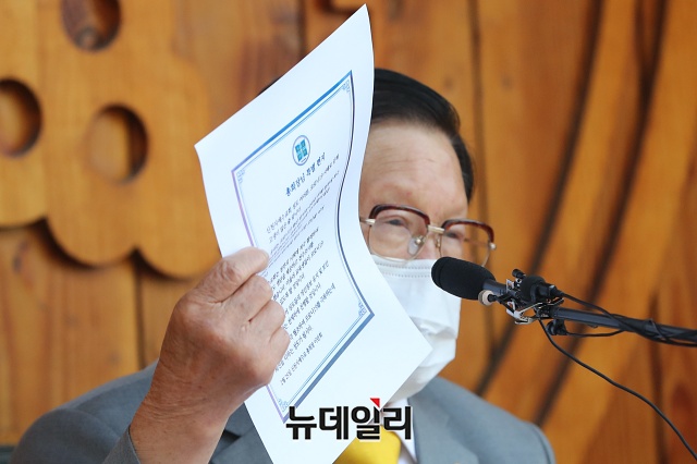 [포토] 입장문 보이는 이만희 신천지 총회장