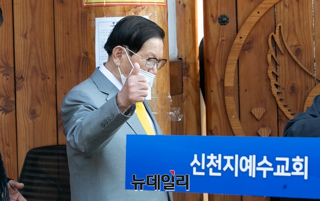 이만희 '신천지예수교 증거장막성전(신천지)' 총회장이 2일 오후 경기 가평군 신천지 평화연수원에서 '코로나19(중국 우한 폐렴)' 관련 공식 입장을 밝히는 기자회견에서 사죄의 뜻을 밝히고 엄지를 올리며 퇴장하고 있다.