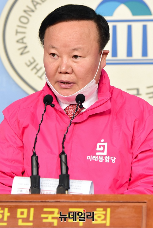 김재원 미래통합당 정책위의장이 4일 오전 국회 정론관에서 '미세먼지 대책' 공약 발표를 하고 있다. 공약은 △월성1호기 재가동 △신한울 3·4호기 건설재개 △에너지관련법개정으로 원정 가동률 80% 유지 등의 내용을 담고 있다.