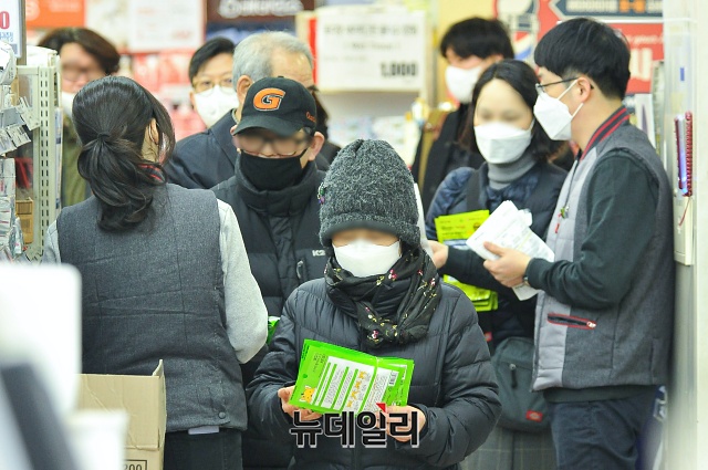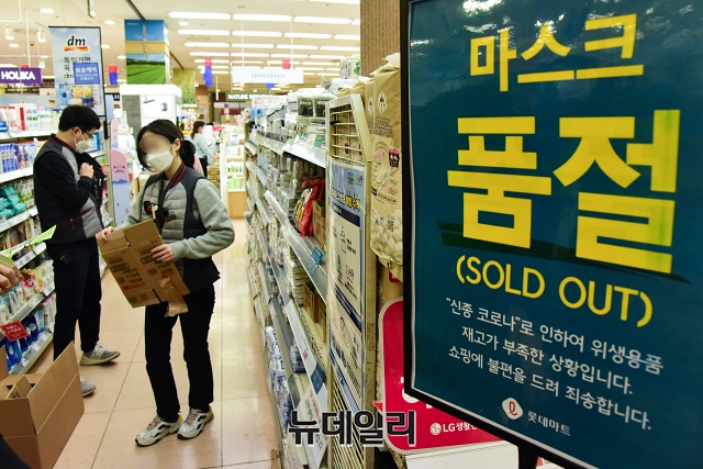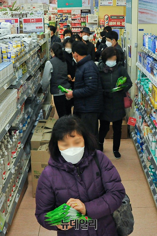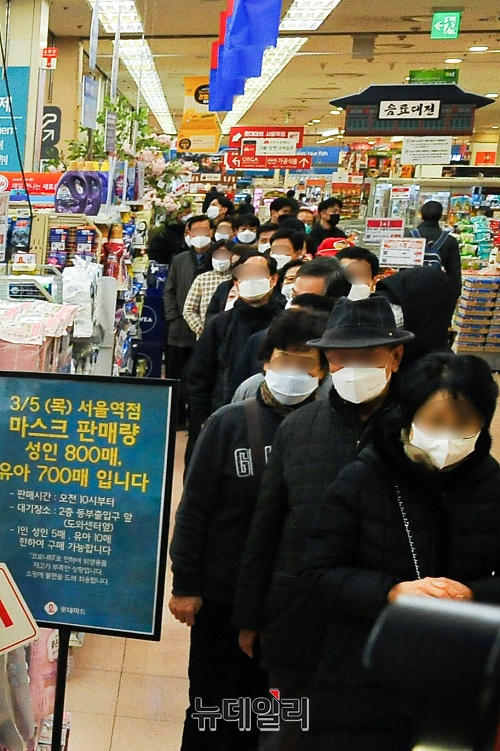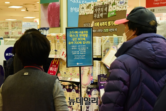 마스크 품귀 현상이 이어지는 5일 오전 서울 중구의 대형마트에서 시민들이 입고되는 보건용 마스크를 구매하기 위해 줄을 서 있다.안내문에는 "마스크 판매량은 성인 800매, 유아 700매이며, 오전 10시부터 1인당 성인 5매, 유아용 10매에 한하여 구매가 가능하다"고 적혀있다.마트측은 구매 번호표 발급했다. 마스크는 15분만에 품절됐다.정부는 오후 정부서울청사에서 마스크 수급 대책 브리핑을 공적마스크 구매할 수 있는 날짜를 정한 5부제와 1인 2매로 구매를 제한하는 내용을 발표했다.