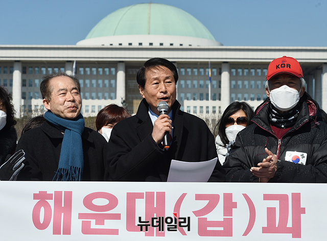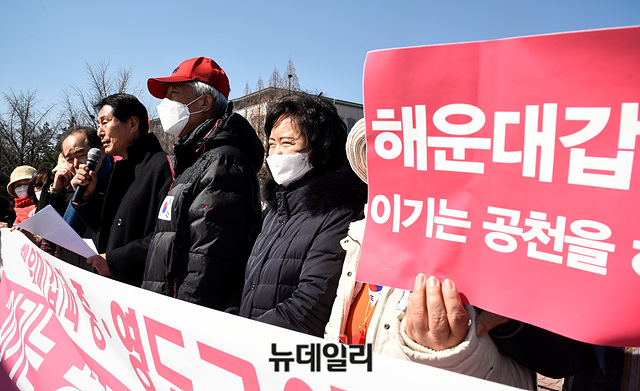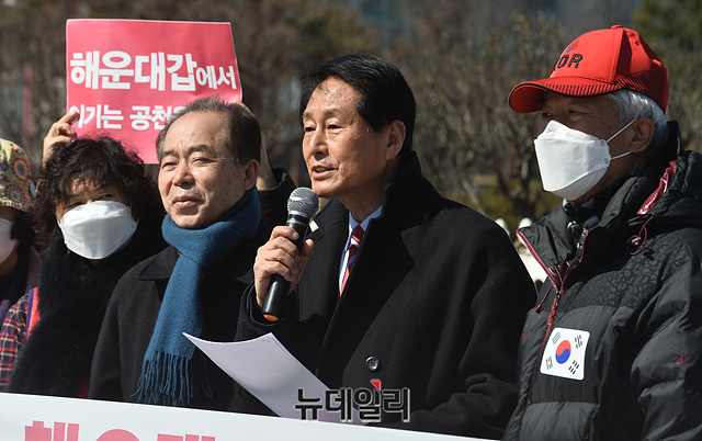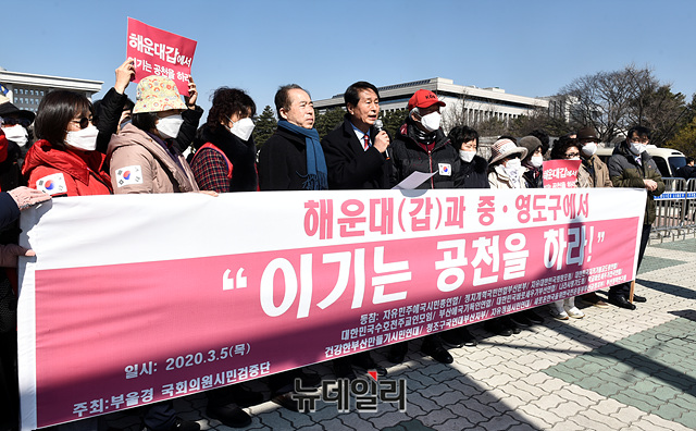 나영수 부울경 국회의원시민검증단 단장, 전종호 해운대지부장 등 15개 시민단체들이 5일 오전 국회 앞 정문에서 하태경 공천 반대 기자회견을 갖고 있다.
