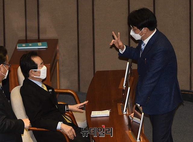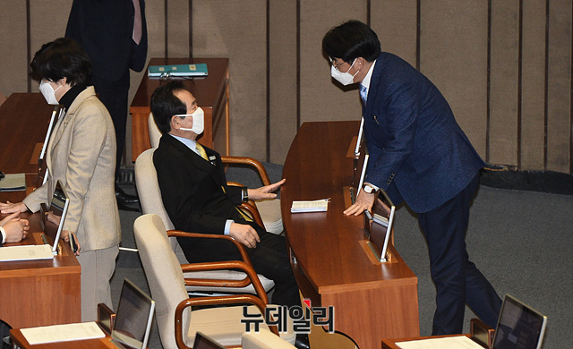 정세균 국무총리와 박용진 더불어민주당 의원이 5일 오후 국회 본회의장에서 열린 제376회국회(임시회) 제8차 본회의에서 대화를 나누고 있다.