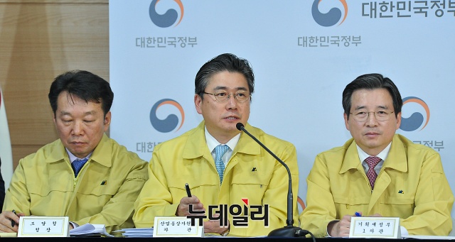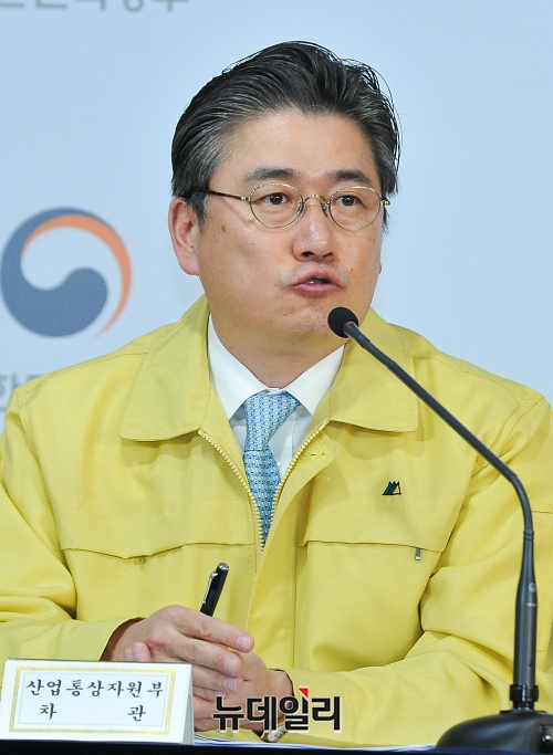 정승일 산업통상자원부 차관(가운데)이 5일 오후 서울 종로구 정부서울청사에서 열린 마스크 수급 안정화 대책 합동 브리핑에서 취재진의 질문에 답하고 있다.