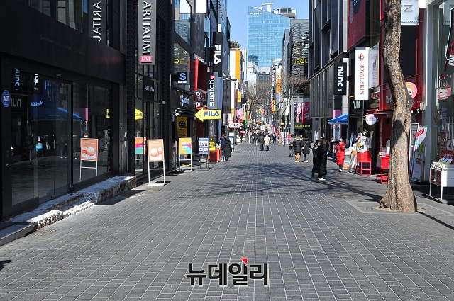 국내 '코로나19(중국 우한 폐렴)' 확진환자가 6천명을 돌파한 5일 오후 서울 중구 명동거리가 관광객들의 발길이 끊겨 한적한 모습을 보이고 있다.