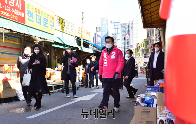 4.15 총선에서 서울 종로구에 출마하는 황교안 미래통합당 대표가 5일 오후 서울 종로구 동대문 문구·완구거리를 방문해 상인들과 인사를 나누고 있다.