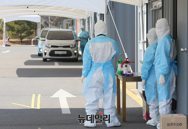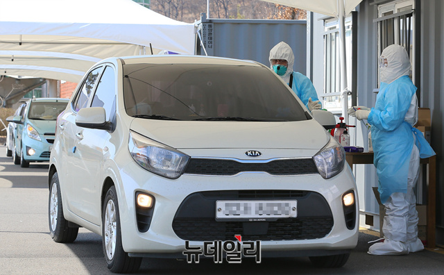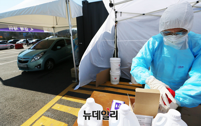 '코로나19(중국 우한 폐렴)' 확진환자가 6,088명을 기록하고 있는 5일 오후 경기 김포시 뉴고려병원 앞에 마련된 드라이브 스루 선별진료소에서 의료진이 검체를 채취하고 있다.