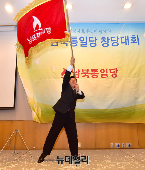 탈북민들이 주축으로 한 남북통일당이 6일 오후 서울 여의도 전경련 컨퍼런스회관에서 창당대회를 갖고 당기를 공개하고 있다.