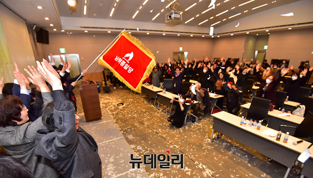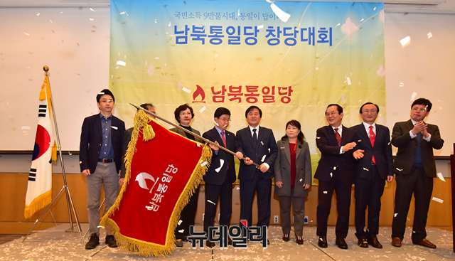 탈북민들이 주축으로 창당한 남북통일당이 6일 오후 서울 여의도 전경련 컨퍼런스회관에서 창당대회를 갖고, 신임 지도부가 당기를 흔들고 있다. 초대 당대표는 안찬일 세계북한연구센터 소장과 김성민 자유북한방송 대표가 공동으로 맡았다.