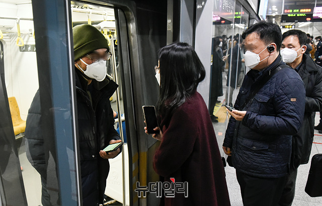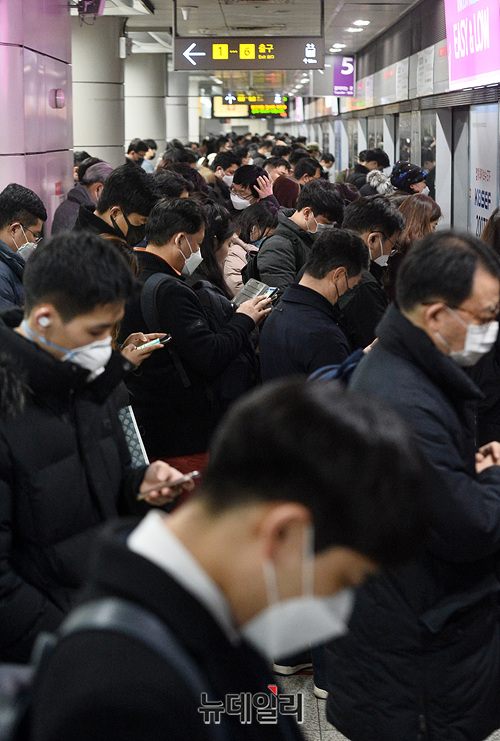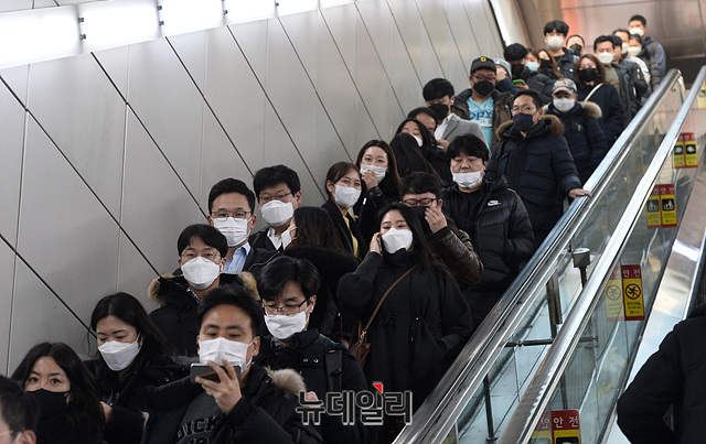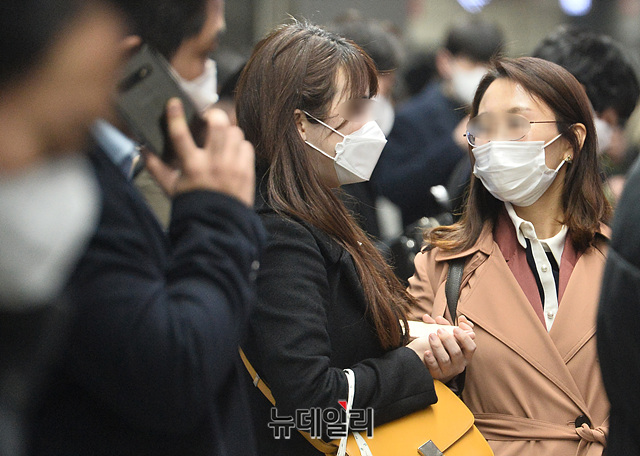 국내에서 '코로나19(중국 우한 폐렴)' 확진자가 309명이 추가로 발생해 6,593명을 나타낸 6일 오후 서울 영등포구 여의도역에서 시민들이 마스크를 낀채 지하철을 타기 위해 이동하고 있다.문재인 대통령은 오늘(6일) "코로나19 사태 대응책인 '마스크 5부제'의 대리수령 범위를 넓히라"고 청와대에 지시했다. 현재 공적 마스크의 공급대책에는 대리 수령은 장애인만 하도록 되어있다.'마스크 5부제'는 출생연도에 따라 마스크를 살 수 있는 요일을 정한 제도로, 1인당 공적 마스크 구매수량을 일주일에 2매까지만 허용한다.이날 오후 국내 코로나19 현황은 △확진환자 6,593명 △검사진행 21,832 △사망자 42명으로 집계됐다.