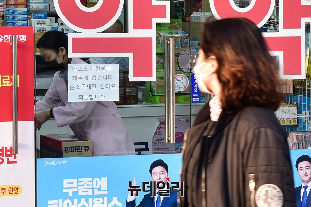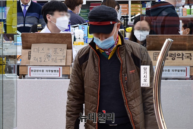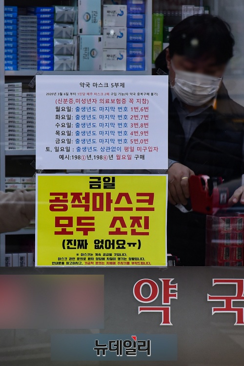 정부가 '마스크 3대 구매 정책' 발표 후 중복구매 확인시스템을 첫 가동한 6일 오후 서울 종로구 종로5가역 주변 약국에 공적 마스크가 품절됐다는 문구가 적혀있다.9일부터 전격시행되는 '마스크 5부제'를 잘 모르고 약국을 찾은 시민들은 마스크를 구입하지 못하고 대부분 발길을 돌렸다.9일부터 출생연도 끝자리가 '1, 6'이면 월요일, '2, 7'은 화요일, '3, 8' 수요일, '4, 9' 목요일, '5, 0' 금요일에 약국을 찾아야 된다. 1주일에 1인 2매를 구입할 수 있다.6일 오후 현재 '코로나19(중국 우한 폐렴)' 감염증 현황은 확진환자 6,593명, 사망자 43명이다.