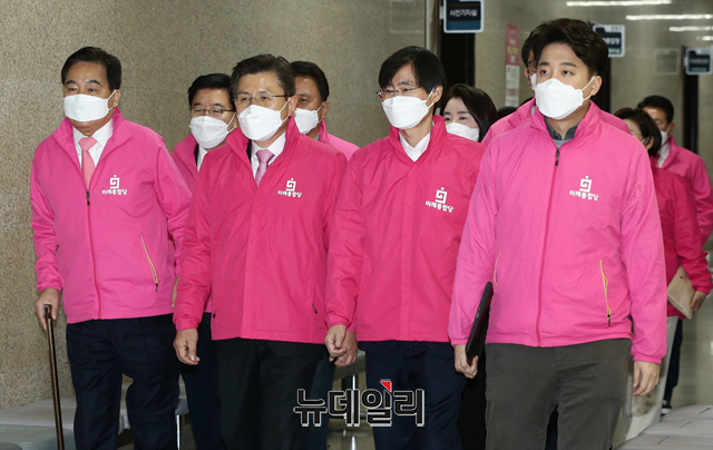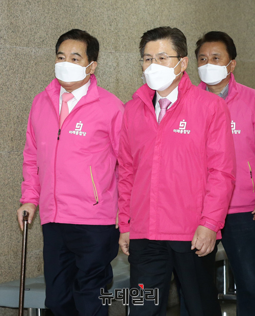 황교안 미래통합당 대표와 심재철 원내대표가 9일 오전 국회에서 열린 최고위원회의에 참석하기 위해 입장하고 있다.