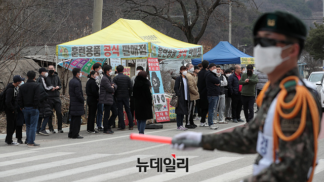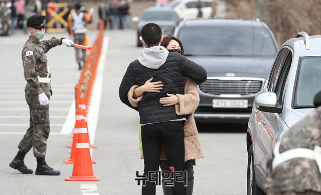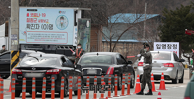 마스크 5부제가 실시된 9일 오후 강원 육군 6사단 신병교육대에 입영장병들이 마스크를 낀채 입소하고 있다.6사단 신병교육대는 '코로나19(중국 우한 폐렴)' 확산 방지를 위해 입대 행사를 취소하고 차량에서 입영장병들만 하차하게 했다. 이어 위병소 앞에 설치된 간이 코로나19 검사소에서 발열 체크, 문진 등을 실시했다.'마스크 5부제'는 출생연도에 따라 마스크를 살 수 있는 요일을 정한 제도로, 1인당 공적 마스크 구매수량을 일주일에 2매까지만 허용한다.이날 오후 국내 코로나19 현황은 △확진환자 7,382명 △검사진행 17,458 △사망자 51명으로 집계됐다. (강원 철원=박성원 기자)