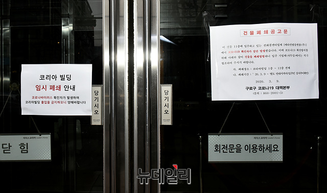9일 '코로나19(중국 우한 폐렴)' 확진자가 무더기로 발생한 서울 구로구 코리아빌딩에 10일 오전 '건물 폐쇄 공고문'이 붙어 있다.