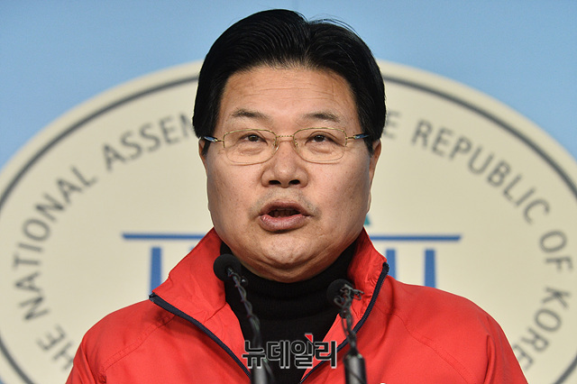 홍문종 친박신당 대표가 10일 오전 국회 정론관에서 정당등록 관련 기자회견을 갖고 있다.
