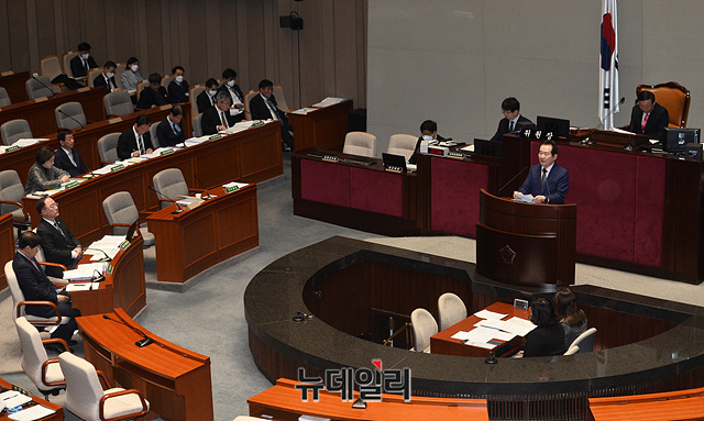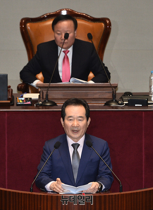 정세균 국무총리가 11일 오전 국회 예결위회의장에서 열린 예산결산특별위원회 전체회의에서 제안설명을 하고 있다.