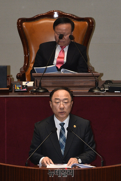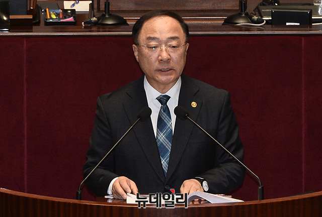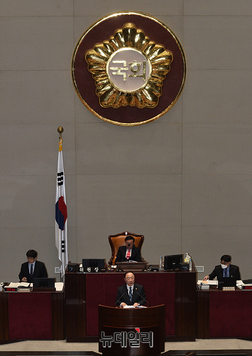 홍남기 경제부총리 겸 기획재정부 장관이 11일 오전 국회 예결위회의장에서 열린 예산결산특별위원회 전체회의에서 제안설명을 하고 있다.