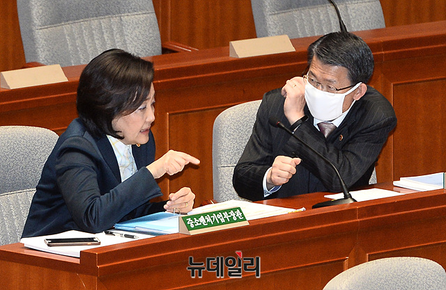 박영선 중소벤처기업부 장관과 은성수 금융위원장이 11일 오전 국회 예결위회의장에서 열린 예산결산특별위원회 전체회의에서 대화를 하고 있다.