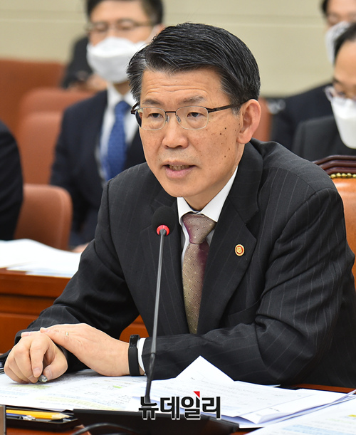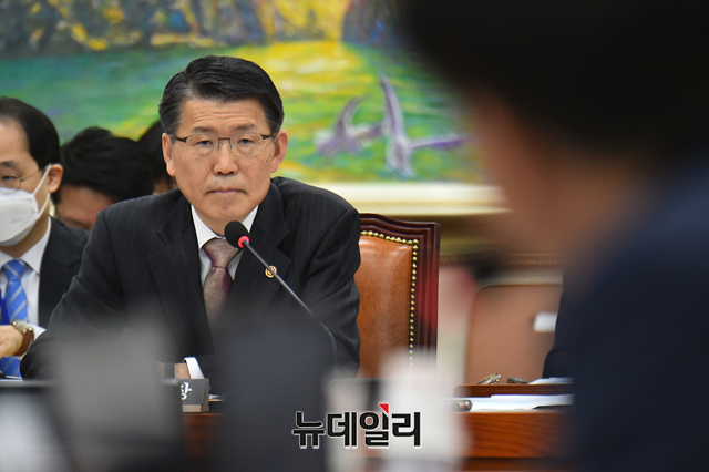 은성수 금융위원장이 11일 오전 국회에서 열린 정무위원회 전체회의에 참석해 의원들의 질문에 답하고 있다.