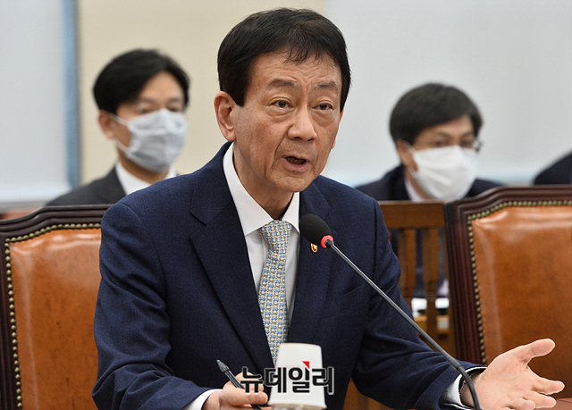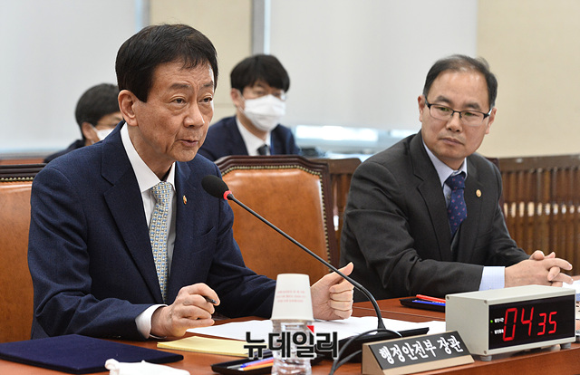 진영 행정안전부 장관이 11일 오후 국회에서 열린 행정안전위원회 전체회의에서 의원들의 질의에 답하고 있다.