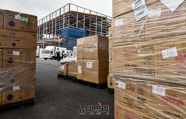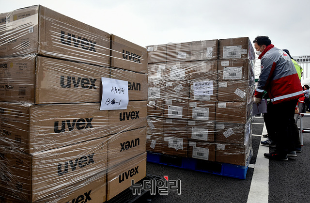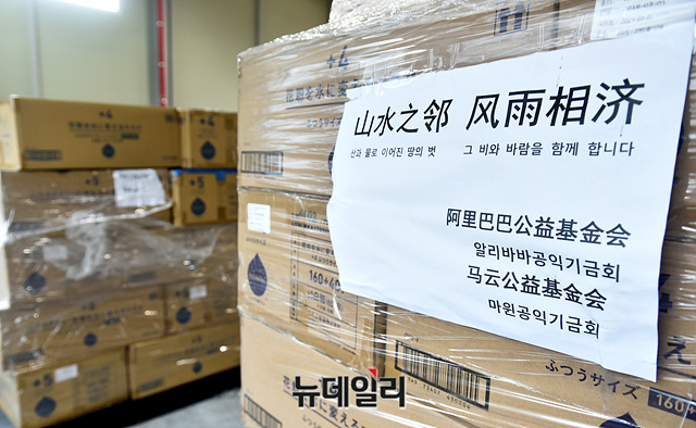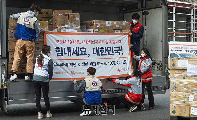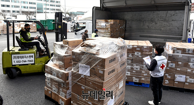 국내 수도권에서 '코로나19(중국 우한 폐렴)' 사망자가 처음 나온 12일 오전 대한적십자사가 인천 중구 현대로지스앤팩 창고 내 한진물류창고에서 중국 전자상거래 업체 '알리바바(Alibaba)' 창업자 '마윈(Ma Yun)' 전 회장이 기부한 마스크 100만개를 트럭에 싣고 있다.마스크는 대구·경북 등 생활치료센터 경증환자들에게 10만장, 국가 지정 감염병 전담병원 등 87개소 등 의료진에게 44만장, 코호트 격리시설 격리자에게 20만장, 감염 우려가 높은 노인·장애인 등 취약계층에게 26만장이 우선 지원된다.이날 오전 국내 코로나19 현황은 ▲확진환자 7,869명 ▲검사진행 17,727명 ▲사망자 66명으로 집계됐다. (인천=박성원 기자)