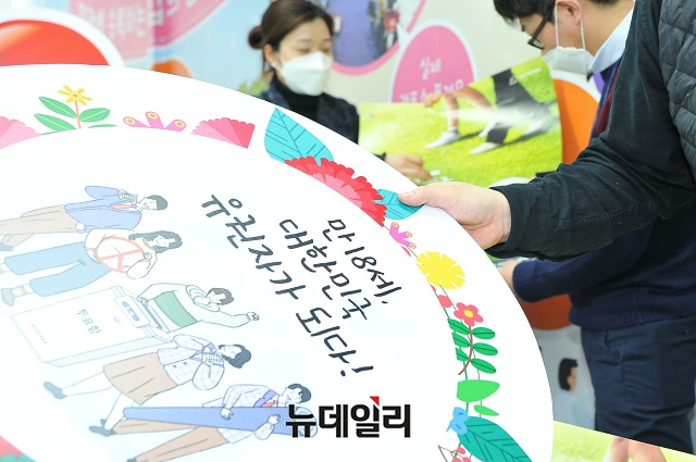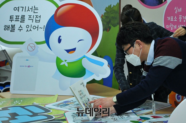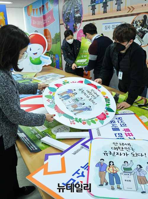 서울시 선거관리위원회 직원들이 12일 오후 서울 종로구 서울특별시 선거관리위원회 선거체험관에서 21대 국회의원선거에 쓰일 만18세 유권자 홍보에 활용할 포스터 및 소품들을 점검하고 있다.
