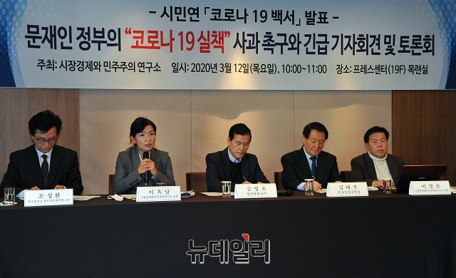 이옥남 시장경제와민주주의연구소 소장이 12일 오전 서울 중구 프레스센터에서 '코로나19 실책 백서' 발표 기자회견을 갖고 있다.시장경제와민주주의연구소는 문재인 정권의 '코로나19(중국 우한 폐렴)'에 대한 사실을 정리하고, 실책을 기록해 다시는 국민의 권강권과 생명권이 희생되지 않도록 '코로나19 실책 백서'를 발간한다.백서엔 △코로나19 발생 일지 △코로나19와 문재인 대통령 공식 일정 △코로나19 대응에 대한 정부의 실책 등의 내용이 담겼다.(사진은 왼쪽부터 조성환 경기대학교 정치전문대학원 교수, 이옥남 시장경제와민주주의연구소 소장, 김영호 성신여대 교수, 김태우 전 통일연구원장, 이영조 시장경제와민주주의연구소 이사장.)