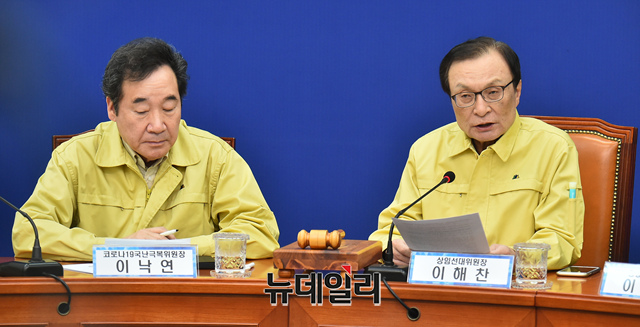 이해찬 더불어민주당 대표가 13일 오전 국회에서 열린 '코로나19 국난극복위원회 선거대책위원회 연석회의'에 참석해 모두발언을 하고 있다.