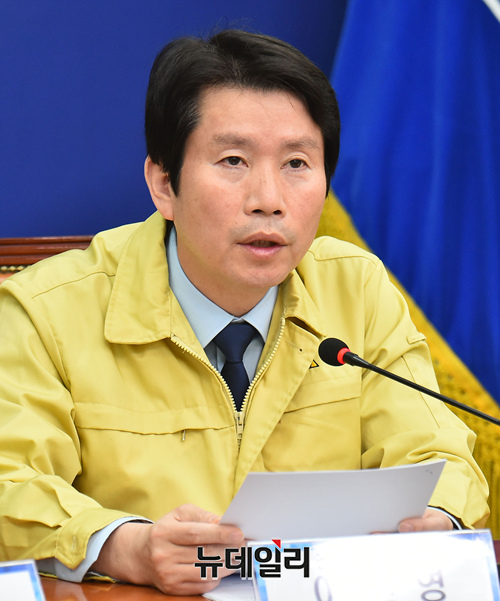 이인영 더불어민주당 원내대표가 13일 오전 국회에서 열린 '코로나19 국난극복위원회 선거대책위원회 연석회의'에 참석해 모두발언을 하고 있다.