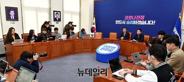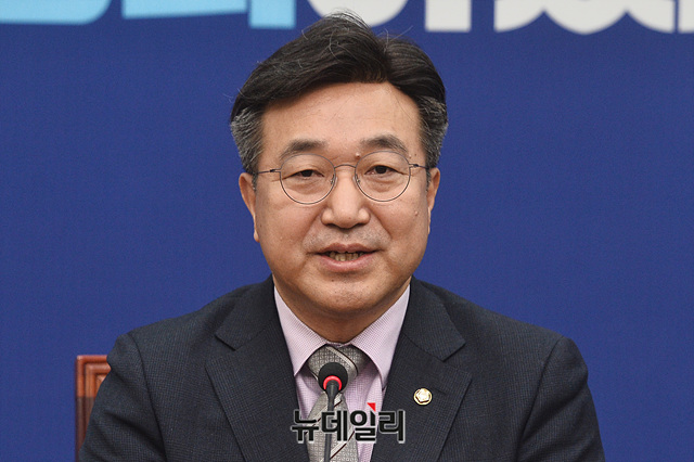 윤호중 더불어민주당 사무총장이 15일 오후 국회에서 열린 기자간담회에서 비례연합정당 진행 상황과 향후 계획 등을 말하고 있다.