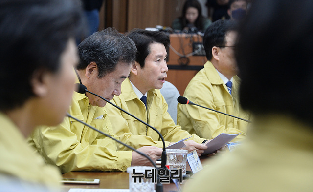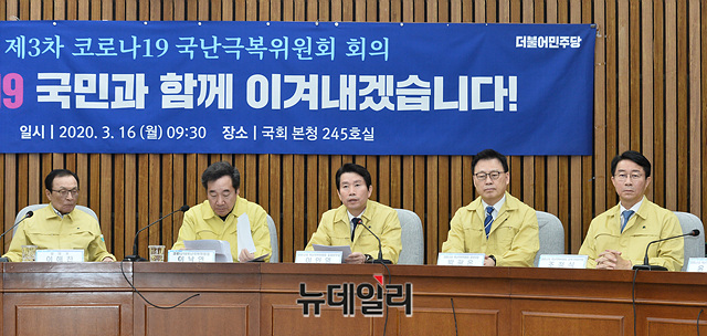 이인영 더불어민주당 원내대표가 16일 오전 국회에서 열린 제3차 코로나19 국난극복위원회 회의에서 모두발언을 하고 있다.이 원내대표는 "어제(15일) 미래통합당은 우리의 코로나19 관련 추가경정예산을 '헬리콥터형 현금살포, 포퓰리즘'이라고 맹공격했다"며 "반면 권영진 대구시장은 추경을 포퓰리즘이라고 하면 국민 아픔에 공감하는 정치가 아니라며 미래통합당에 추경처리를 강력히 요청했다"고 말했다.이어 "비상(非常)한 상황엔 비상(非常)하게 대응하는게 문제해결이다"며 미래통합당에 "추경안 증액에 합의하라"고 촉구했다.