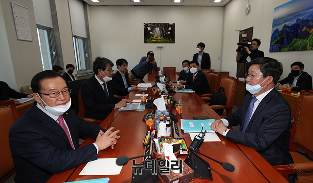 전해철 더불어민주당 예결위 간사, 이종배 미래통합당 간사, 김광수 민생당 간사, 구윤철 기재부 2차관이 16일 오후 국회에서 코로나19 추경안과 관련해 회동하고 있다.