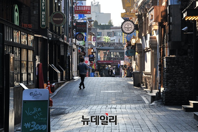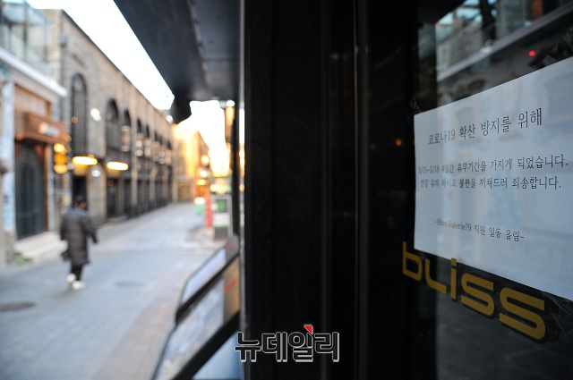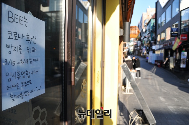 특별입국절차 적용대상을 유럽 전역으로 확대한 16일 오후 서울 용산구 이태원역 주변 가게에 임시휴업 문구가 붙어있다. 임시휴업을 한 매장이 많아 이태원 거리는 대체적으로 한산한 모습을 보였다.정세균 국무총리는 오늘 중대본 회의에서 ”유럽을 중심으로 한 ‘코로나19(중국 우한 폐렴)’ 확산세가 심상치 않다”며 특별입국절차 적용대상을 유럽 전역으로 확대했다.16일 오후 현재 '코로나19' 감염현황은 확진환자 8,236명, 사망자 79명을 기록하고 있다.