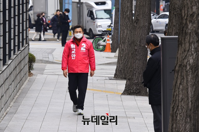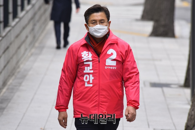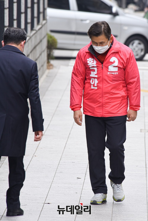 황교안 미래통합당 대표가 17일 오후 서울 종로구 주한중국문화원 앞에서 광화문광장 관련 공약발표를 위해 이동하고 있다.