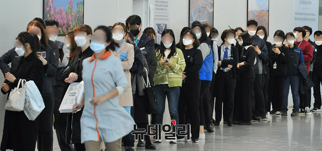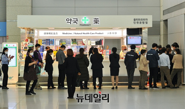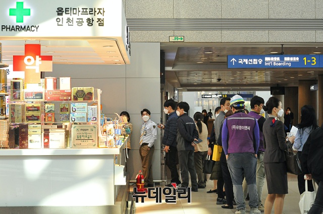 우한코로나(코로나-19)의 세계적 대유행에 따른 전 국가 모든 입국자를 대상으로 특별입국절차를 실시하기 하루 전인 18일 오후 인천국제공항 관계자들이 마스크를 구매하기 위해 공항 내 약국에 줄을 섰다.코로나-19 여파로 항공업계가 비상에 처하고 이용객이 줄어 한산한 인천공항이었지만, 유일하게 약국 앞에는 공적 마스크를 구매하려는 사람들로 붐볐다. 오후 4시부터 판매한 공적 마스크는 20분 만에 매진됐다. (인천= 권창회 기자)