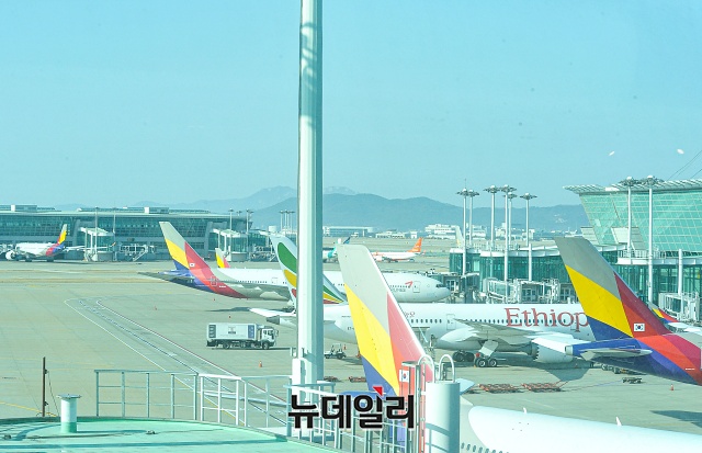 '코로나19(중국 우한 폐렴)' 세계적 대유행에 따른 전 국가 모든 입국자를 대상으로 특별입국절차를 실시하기 하루 전인 18일 오후 인천국제공항에 항공기가 주기돼 있다.정부는 '코로나19' 여파로 항공업계가 비상위기에 처하자 운항중단으로 미 사용한 운수권과 슬롯(시간당 비행기 운항 가능 횟수) 회수 전면 유예와 공항시설사용료 감면 확대 등의 대책을 내놨다.추가적으로 항공기 착륙료 20%를 즉시 감면하고, 항공기 정류료도 3개월 전액 면제할것이라 밝혔다. (인천=권창회 기자)