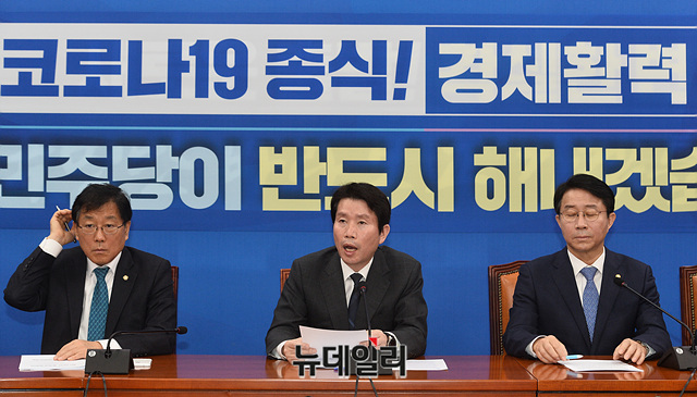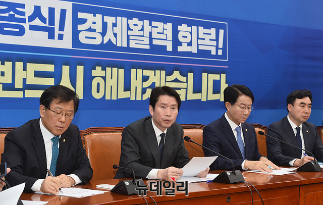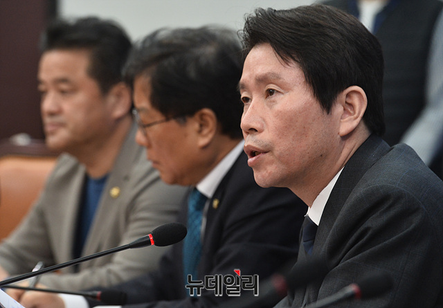 이인영 더불어민주당 원내대표가 19일 오전 국회에서 열린 정책조정회의에서 모두발언을 하고 있다.