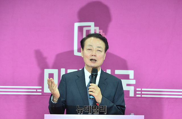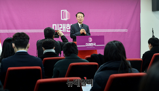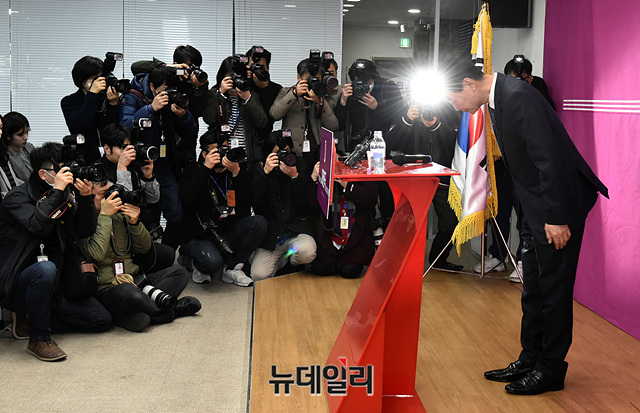 한선교 미래한국당 대표가 19일 오후 서울 영등포구 미래한국당 당사에서 열린 당 대표직 사퇴 기자회견을 갖고 있다. 이날 한국당 비례대표 후보자 추천 명단은 선거인단에 의해 부결됐다.