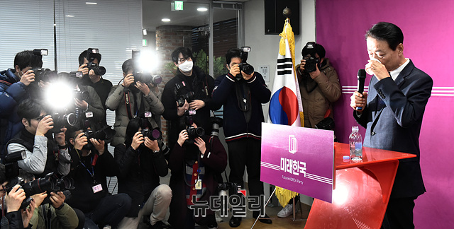 한선교 미래한국당 대표가 19일 오후 서울 영등포구 미래한국당 당사에서 열린 당 대표직 사퇴 기자회견에서 물을 마시고 있다. 이날 한국당 비례대표 후보자 추천 명단은 선거인단에 의해 부결됐다.